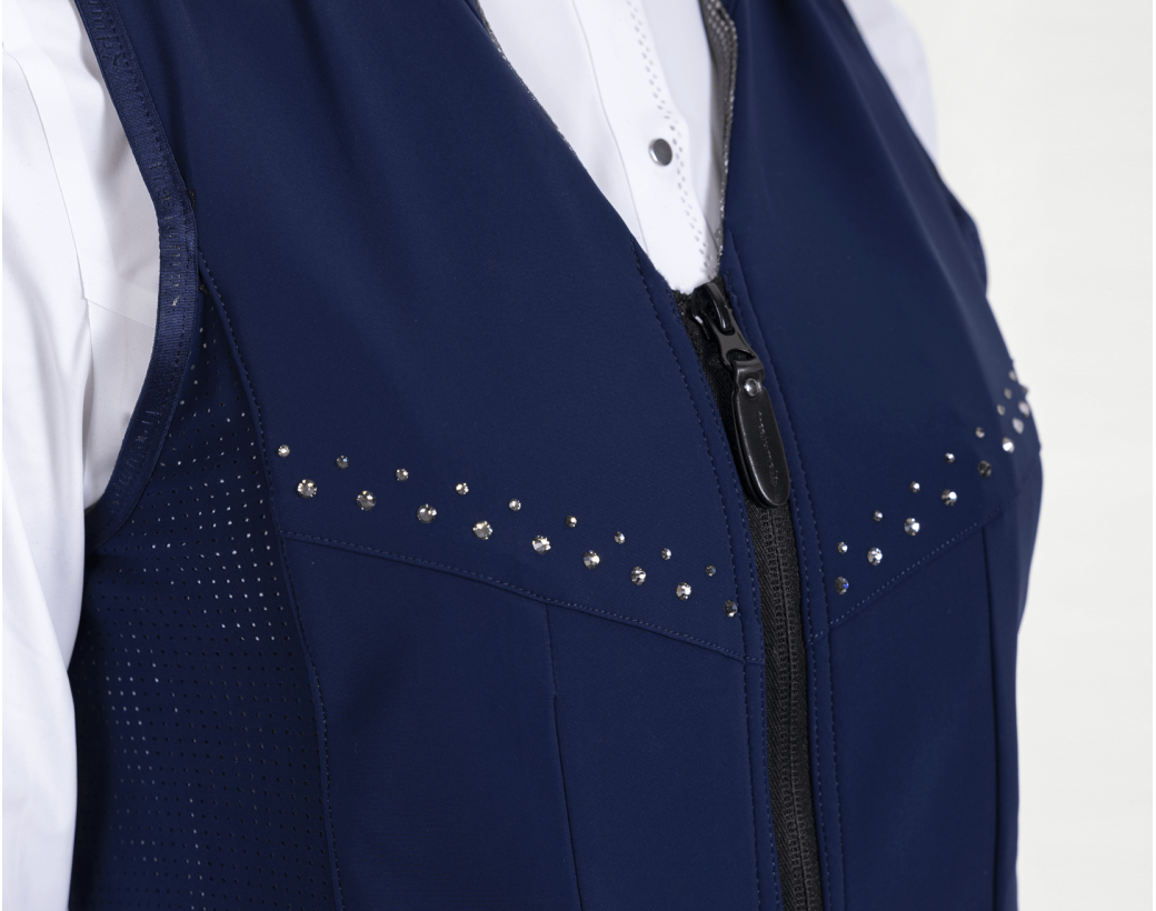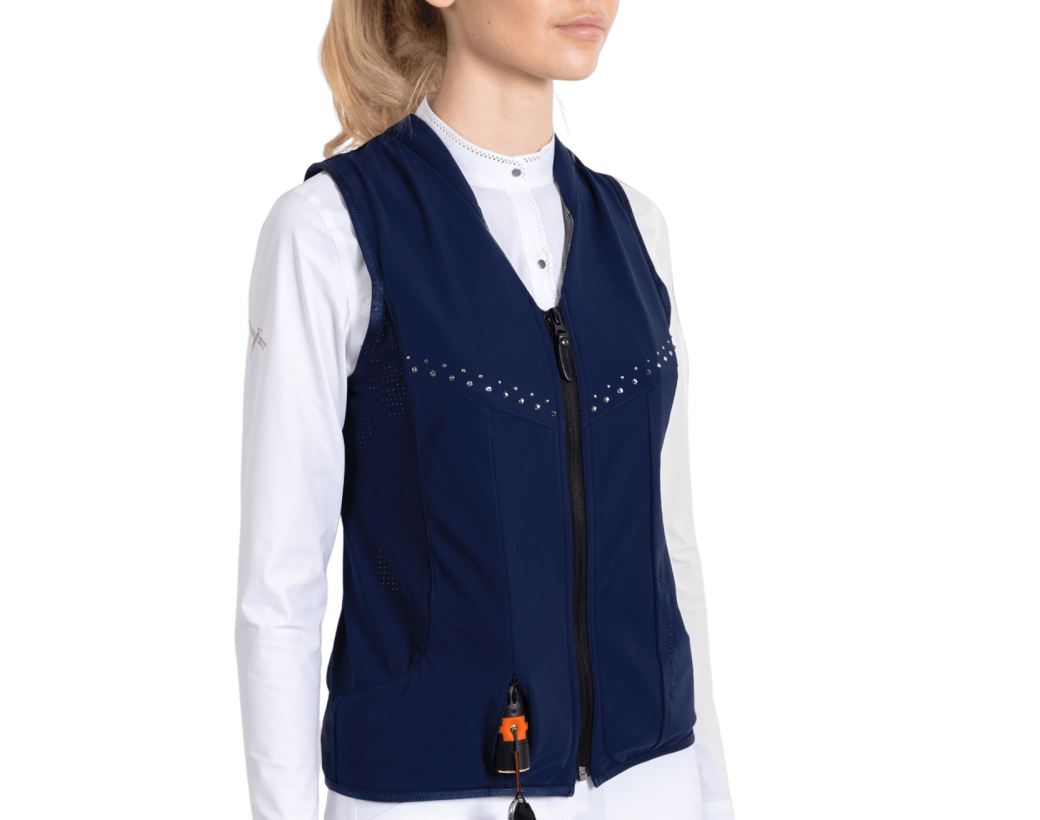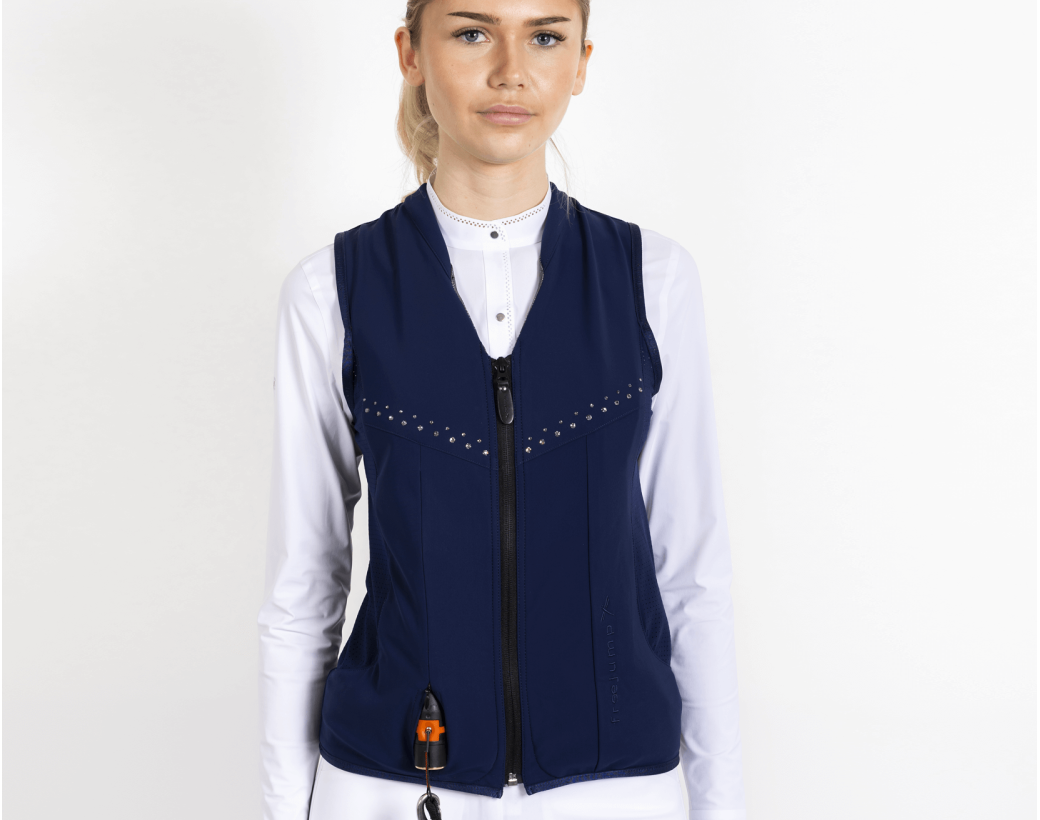 Designet med krystaller foran, er FREEJUMP AIRBAG CRYSTAL en beskyttelsesvest spesielt designet for hestesport for å beskytte vitale områder på rytteren i tilfelle et fall. Den kan brukes over et tynt lag med klær (t-skjorte, genser eller lett genser) eller over en jakke.